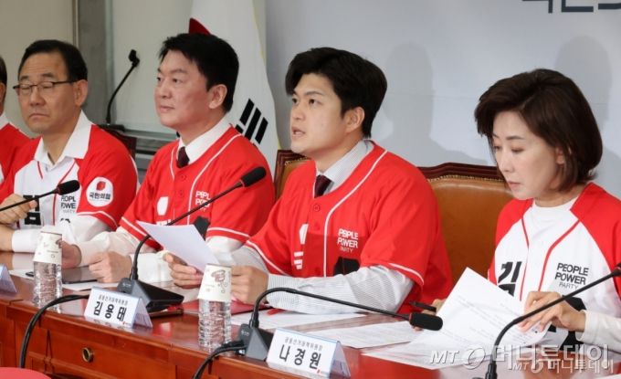 김용태(왼쪽 세 번째) 국민의힘 비상대책위원장이 26일 오전 서울 여의도 국회에서 열린 중앙선거대책위원회의에서 발언하고 있다./사진=뉴시스