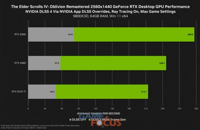 1920x1080에서는 4.3배의 성능 배수 덕분에 모든 지포스 RTX 50 시리즈 사용자가 '엘더스크롤 4: 오블리비언 리마스터'를 180 FPS 이상으로 플레이할 수 있다. 보다 빠른 GPU에서는 230 FPS 이상의 플레이가 가능하다. 가장 빠른 그래픽 카드인 지포스 RTX 5080과 지포스 RTX 5090에서는 시로딜을 300 FPS 이상으로 탐험할 수 있다.