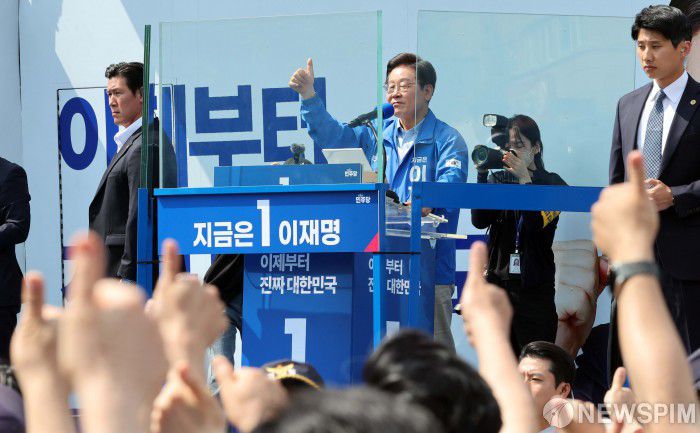 [용인=뉴스핌] 정일구 기자 = 이재명 더불어민주당 대선 후보가 26일 오후 경기도 용인시 단국대학교 죽전캠퍼스 앞에서 유세하고 있다. 2025.05.26 mironj19@newspim.com
