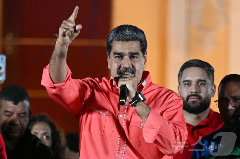 니콜라스 마두로 베네수엘라 대통령이 2025년 5월 25일 카라카스의 볼리바르 광장에서 의회 및 지역 선거 결과를 축하하며 지지자들에게 연설하고 있다. ⓒ AFP=뉴스1