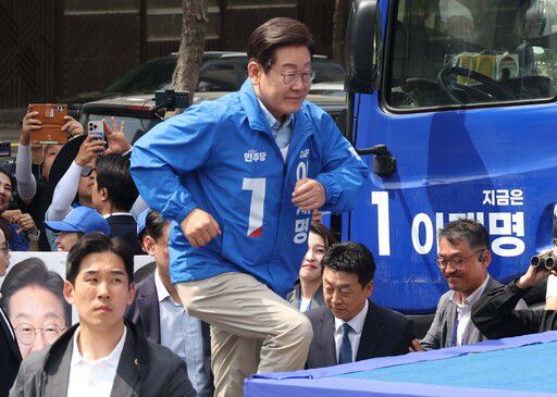 이재명 더불어민주당 대선 후보가 26일 경기 용인시 수지구 단국대 죽전캠퍼스 정문에서 열린 유세에서 연설을 하기 위해 무대위에 오르고 있다. 뉴시스