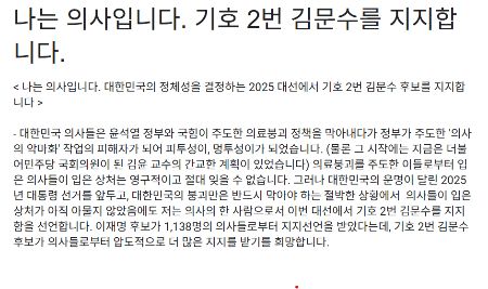 그러나 " 대한민국의 붕괴만은 반드시 막아야 하는 절박한 상황에서 의사들이 입은 상처가 아직 아물지 않았음에도 저는 의사의 한 사람으로서 이번 대선에서 기호 2번 김문수를 지지함을 선언한다"면서 "이재명 후보의 당선을 막는 것이 우선"이라고 적었다. 이 작성자는 "이재명 후보가 1138명의 의사로부터 지지 선언을 받았다는데, 기호 2번 김문수 후보가 의사들로부터 압도적으로 더 많은 지지를 받기를 희망한다"고 부연하기도 했다.