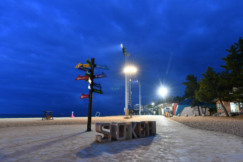 오는 7월 19일부터 8월 10일까지 23일간 야간에도 개장할 예정인 속초해수욕장에 조명이 환하게 켜져 있다. 속초시 제공 |