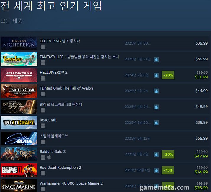 한편, 스팀 전 세계 최고 판매 제품에서는 엘더 스크롤 스타일의 ‘테인티드 그레일: 더 폴 오브 아발론(Tainted Grail: The Fall of Avalon)’이 약 2년 만에 정식 출시를 하며 4위에 올랐다. 이어 크로스 플레이 오류를 수정한 발더스 게이트 3가 8위를 차지했다.