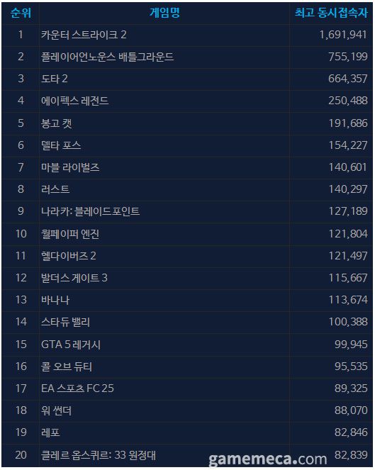 일 최고 동시접속자 TOP 20에서는 클레르 옵스퀴르: 33 원정대가 주말 유저 유입으로 2만 명 이상 늘어나 8만 2,839명으로 20위를 차지해 다시 순위권에 모습을 보였다. 델타 포스는 5월 10일부터 약 2주째 10만 중반대를 꾸준히 유지 중인데, 지난 달 야간 전투 업데이트를 시작으로 증가하기 시작했으며 지난 22일에는 싱글 모드인 블랙 호크 다운도 출시하는 등 콘텐츠를 꾸준히 추가하며 상승세를 이어가고 있다.