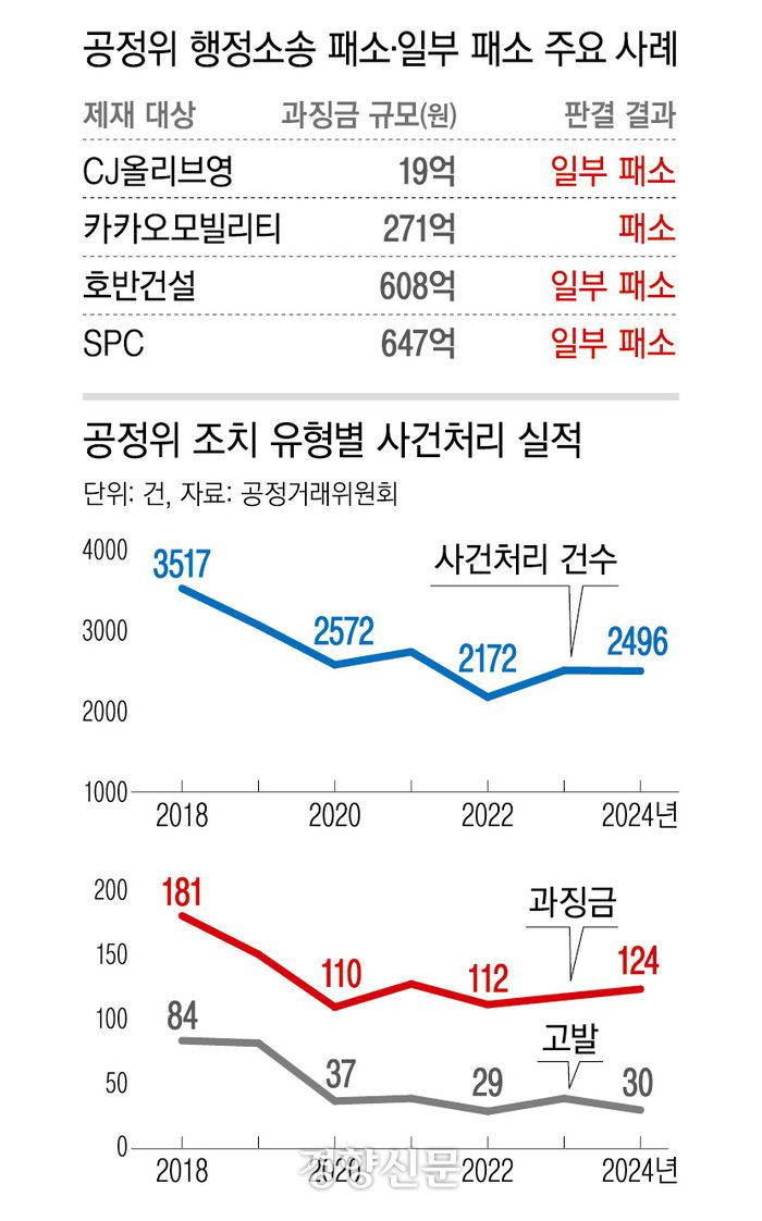 공정거래위원회 제재가 잇따라 법원 앞에서 멈춰 섰다. 최근 법원이 공정위가 카카오모빌리티에 부과한 과징금 전액과 시정명령을 취소한 데 이어 CJ올리브영에 부과했던 과징금도 일부 취소해야 한다고 판결다. 윤석열 정부 들어 공정위의 조사 역량이 위축된 결과라는 지적이 나온다.