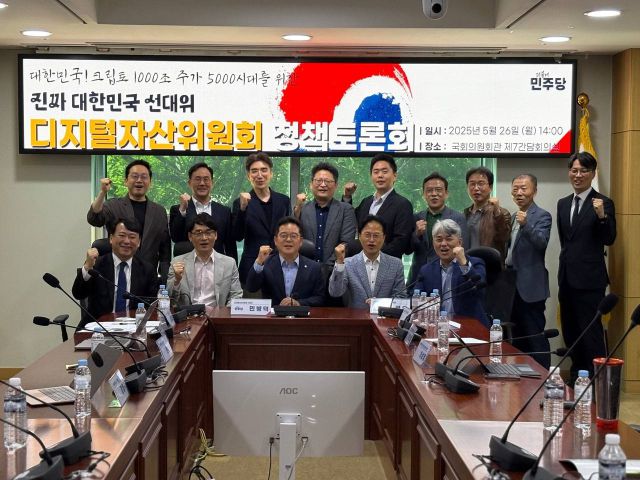 [디지털데일리 박기록기자] 이재명 더불어민주당 대선후보 선대위 산하 디지털자산위원회(위원장 민병덕)는 26일 국회 의원회관에서 민병덕의원(경기 안양 동안갑)와 수석부위원장인 김정우 전 의원 등이 참석한 가운데 ‘대한민국 크립토 1000조, 주가 5000을 위한 정책토론회’를 개최했다고 밝혔다.
