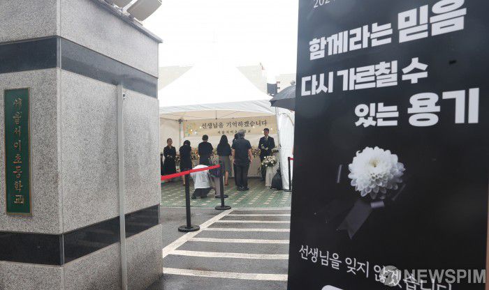 [서울=뉴스핌] 이호형 기자 = 서이초 교사 순직 1주기를 맞아 18일 오후 서울시교육청이 마련한 서초구 서이초 정문 앞 추모공간에 선생님들과 시민들이 헌화와 추모를 하고 있다. 2024.07.18 leemario@newspim.com |