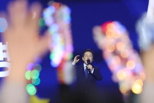 더불어민주당 대선 후보로 선출된 이재명 후보가 지난달 27일 경기 고양시 킨텍스에서 열린 '제21대 대통령선거 후보자 선출을 위한 수도권·강원·제주 경선 및 최종 후보자 선출 대회'에서 수락연설을 하고 있다. 지지자들이 흔드는 응원봉 사이로 연설을 하는 이재명 대선 후보의 얼굴이 보인다. 고양=연합뉴스