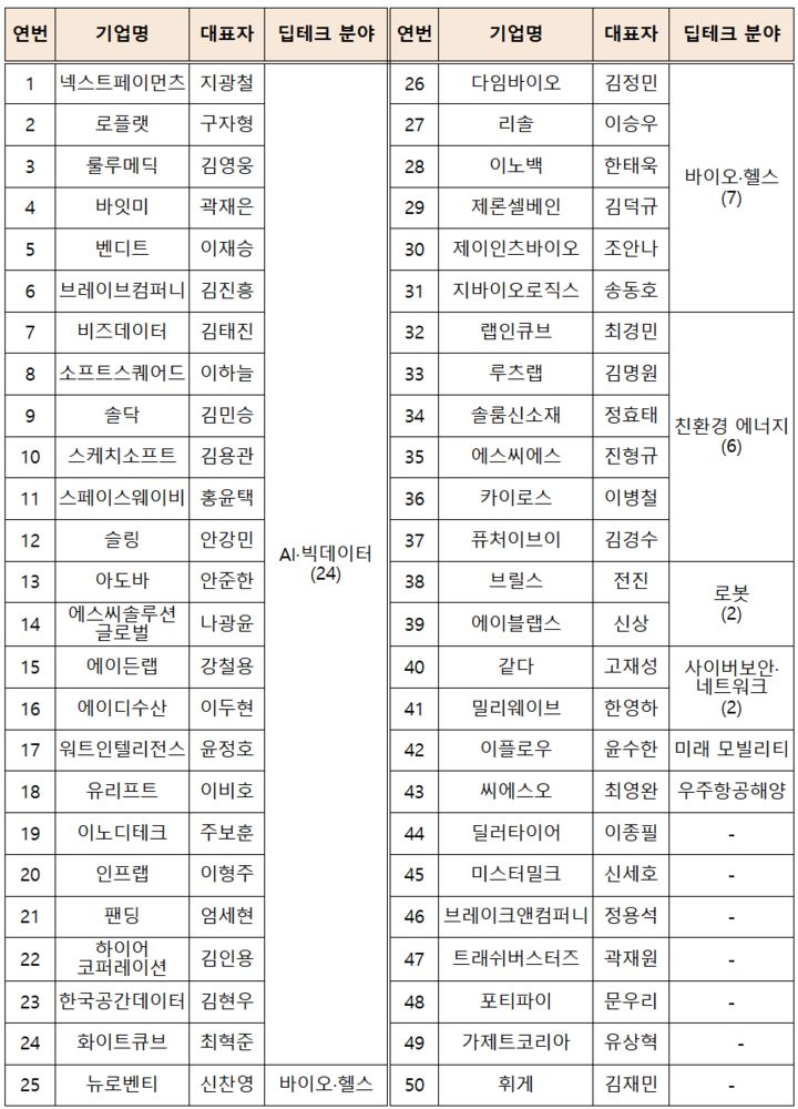 업종을 살펴보면 기술 집약 분야에 대한 쏠림이 뚜렷하다. 전체 50개사 중 43개사가 AI, 빅데이터, 로봇, 모빌리티, 바이오 등 딥테크(Deep Tech) 분야에 집중돼 있다. 생성형 AI를 기반으로 2D 스케치를 3D 도면으로 자동 변환하는 '스케치소프트', 초경량 인휠 모터(AFPM)를 개발한 '이플로우' 등이 대표 사례다.