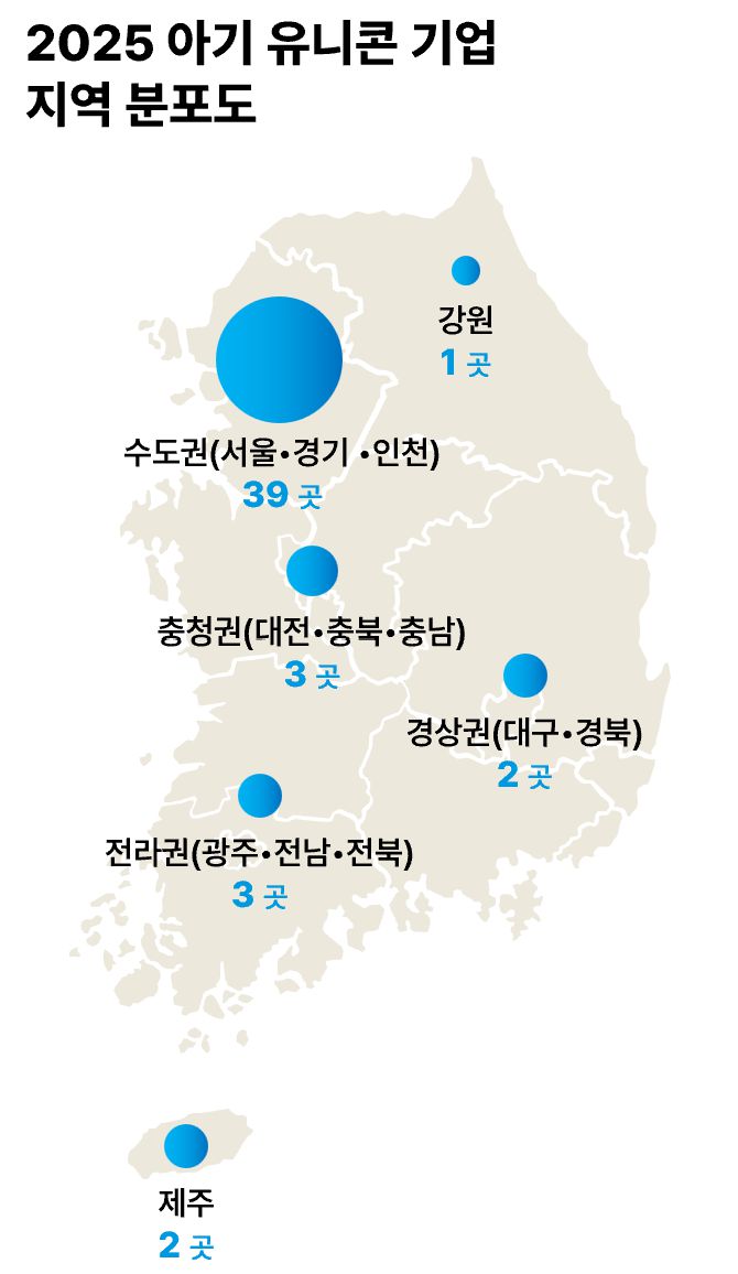 눈에 띄는 지점은 지역 분포다. 올해 선정된 아기유니콘 중 80%가 서울·경기 등 수도권에 몰려 있으며, 비수도권에서는 충북 청주의 랩인큐브, 충남 아산의 루츠랩을 비롯해 강릉, 광주, 대구, 제주에 일부 기업이 분포하는 수준이다. 전문가들은 "수도권은 자본과 인재, 기술 인프라가 집중된 반면, 지방은 창업 환경이 열악하다"며, 지방 기업에 대한 특화된 인센티브 확대를 강조하고 있다.