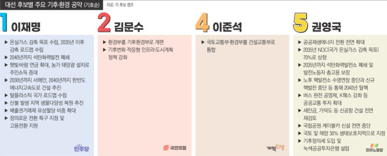 이재명 더불어민주당 대선 후보는 재생에너지 확대 등 방향성은 뚜렷하나 구체성이 떨어지고 일부 논쟁적 사안은 피해갔다는 평가가 나온다. 김문수 국민의힘, 이준석 개혁신당 후보는 에너지 정책 수준에 그쳤다. 기후 관련 공약을 내놓지 않거나 사실상 후퇴한 것으로 평가된다. 권영국 민주노동당 후보는 가장 적극적으로 기후 공약을 내놨다.