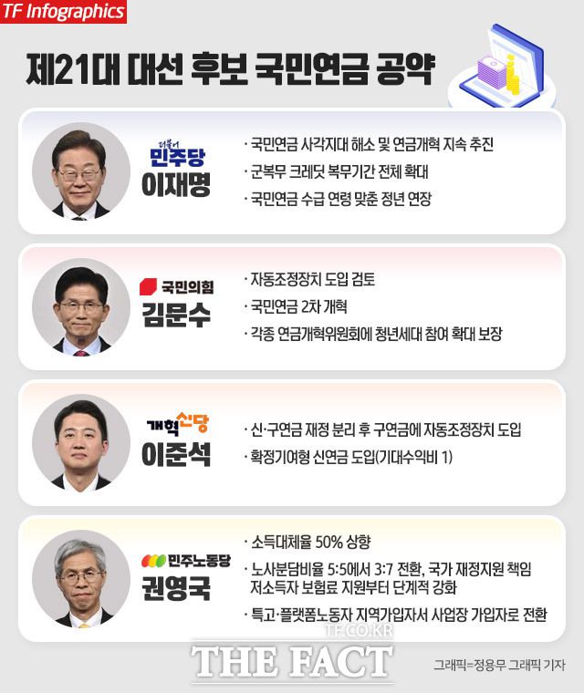 [더팩트ㅣ이준영 기자] 대통령선거 주요 후보들이 국민연금 개혁 공약을 내놨지만 노인빈곤율이 최악인 상황에서 노후 안정과 사각지대 보완이 미흡하다는 평가다.