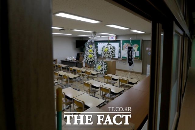 학교 민원 대응체계 개선을 요구하는 교육계 목소리가 커지고 있다. 사진은 서울 서이초등학교 교사의 49재인 2023년 9월 4일 오전 서울 서초구 서이초등학교 숨진 교사의 교실에 화환이 놓인 모습. /더팩트 DB |