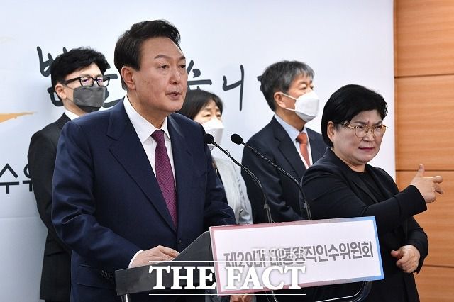 윤석열 대통령 당선인이 2022년 4월 13일 서울 종로구 통의동 인수위 브리핑룸에서 2차 내각 인선 발표를 하고 있다. /인수위사진기자단 |