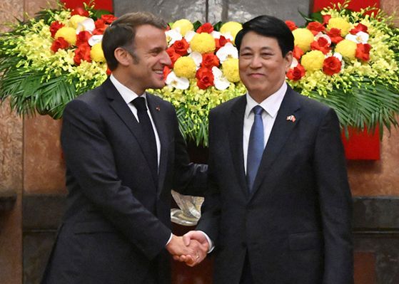 원전 세일즈에 나선 에마뉘엘 마크롱 프랑스 대통령(왼쪽)이 26일 하노이 주석궁에서 르엉끄엉 베트남 국가주석과 악수하고 있다. 베트남은 원전 개발을 추진 중이다. [AP=연합뉴스] |