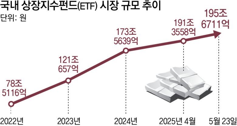 26일 한국거래소에 따르면 23일 기준 국내 ETF 순자산총액은 195조6711억 원에 달한다. 2002년 코스피200을 추종하는 ETF 2종이 처음 상장됐고, 2023년 6월 29일 순자산 100조 원을 넘긴 것을 고려하면 성장세가 가파르다.