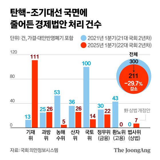 조기 대선이 모든 이슈를 블랙홀처럼 빨아들인 가운데 경제 법안이 국회에서 발 묶여 있다. 중앙일보가 26일 국회 의안정보시스템을 분석한 결과 올 1분기(1~3월) 국회에서 처리한 경제 법안은 총 211건으로 나타났다. 올해와 마찬가지로 국회 개원 2년 차인 21대 국회 같은 기간(2021년 1분기) 300건과 비교하면 29.7%(89건) 감소했다. 경제법안은 기획재정위원회·과학기술정보방송통신위원회·농림축산식품해양수산위원회·국토교통위원회·산업통상자원중소벤처기업위원회·정무위원회(금융)·환경노동위원회(고용)·법제사법위원회(상법) 등 경제 관련 상임위 8곳 소관 법률안을 분석했다.