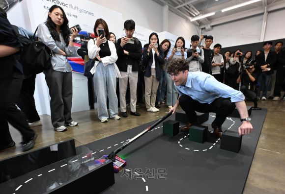 26일 서울 성동구 성수동 무신사 스퀘어4에서 열린 ‘다이슨 신기술 소개 행사’에서 네이슨 로슨 맥클린 시니어 엔지니어링 매니저가 새로운 무선 청소기 ‘펜슬백 플러피 콘’을 사용해 바닥 청소를 시연하고 있다. 도준석 전문기자 |