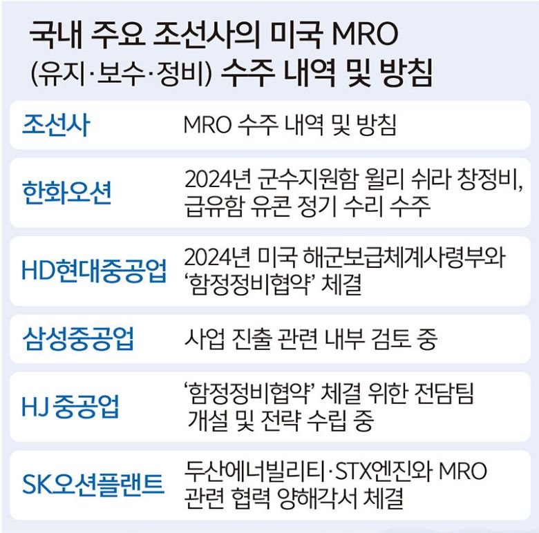 국내 함정 방산 1호 기업인 HJ중공업도 미국 MRO 수주를 위해 전담팀을 꾸려 기술 역량 검증, 현장 실사, 보안 평가 등 심사 절차를 진행 중이다. HJ중공업은 수송함·상륙함 등 대형 군함을 비롯해 유도탄고속함·차기고속정·경비함 등 특수선 제작에 강점이 있다. 이미 독도함과 고속상륙정 등 창정비 사업 등 국내 해군 함정 MRO 실적도 적지 않기 때문이다.