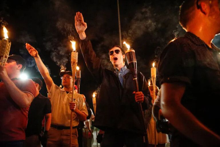 미국 버지니아 샬러츠빌에서 2017년 8월12일 인종주의를 지지하는 극우 성향 지지자들이 남북전쟁 때 남부군 장군인 로버트 리의 동상 철거를 반대하는 폭동을 일으켰다. 이들은 미국의 인종주의 단체인 ‘큐 클럭스 클랜’(KKK)이 흑인 처형 때 했던 횃불 의식이나 나치식 경례를 했다. 유에스에이투데이 누리집 갈무리 |