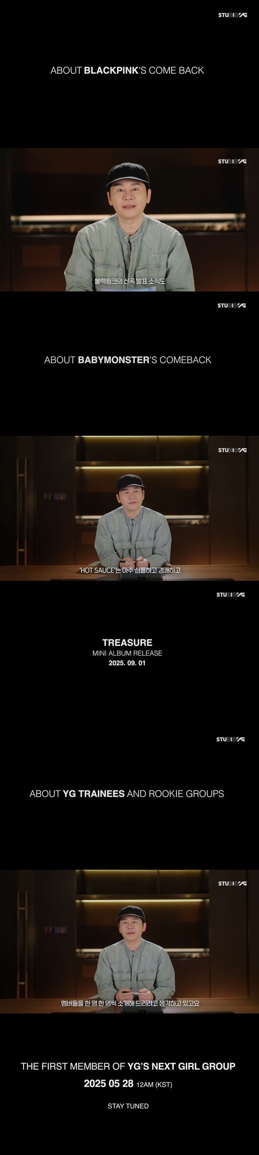 이 기세를 이어 YG는 하반기에도 공격적인 아티스트 활동을 예고했다. 양현석 총괄 프로듀서는 최근 공개한 인터뷰 영상에서 블랙핑크, 베이비몬스터, 트레저 등 소속 아티스트들의 컴백 일정과 함께 신인 그룹 론칭 계획까지 담은 '마스터 플랜'을 직접 소개해 화제를 모았다.