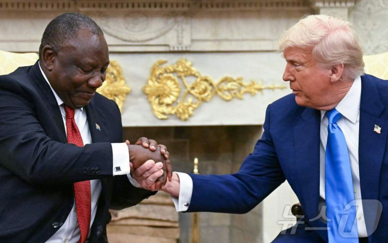 도널드 트럼프 미국 대통령이 21일(현지시간) 워싱턴 백악관에서 시릴 라마포사 남아프리카 공화국 대통령과 정상 회담 중 악수를 하고 있다. 2025.05.22 ⓒ AFP=뉴스1 ⓒ News1 우동명 기자