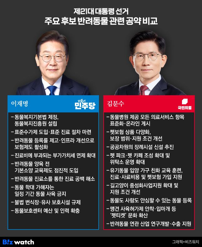 21대 대통령 선거를 앞두고 이재명 더불어민주당 후보와 김문수 국민의힘 후보가 반려동물 관련 공약을 발표했다. 이재명 후보는 반려동물 등록률 제고·표준수가제 도입을, 김문수 후보는 전 의료서비스 항목 표준화·펫보험 상품 다양화 등을 내걸었다.
