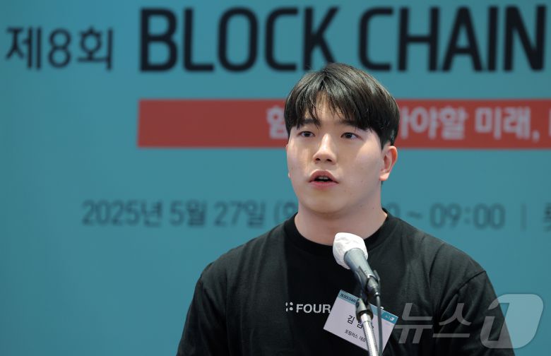(서울=뉴스1) 박정호 기자 = 김남웅 포필러스 대표가 27일 오전 서울 중구 롯데호텔에서 열린 제8회 뉴스1 블록체인 리더스클럽에서 '새 정부에 바란다 - 블록체인과 가상자산에 대한 오해와 진실' 주제발표를 하고 있다. 2025.5.27/뉴스1