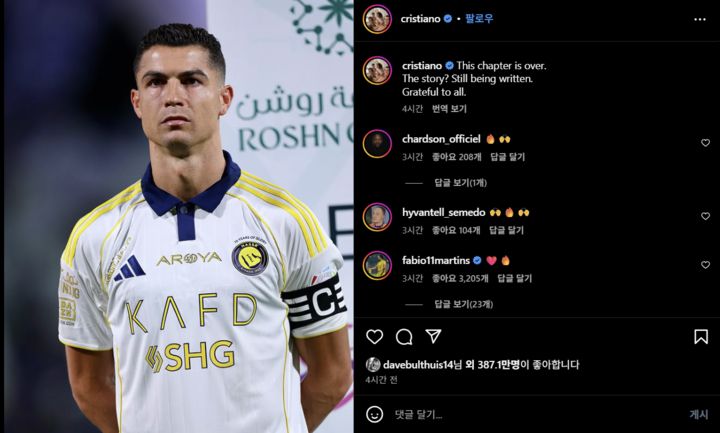 호날두는 27일(한국시간) 자신의 SNS를 통해 "이 챕터는 끝났다. 이야기는? 아직 쓰여지고 있다. 모두에게 감사하다"는 글을 올렸다. 6억 5천만 명에 달하는 팔로워들에게 즉각 퍼져나간 이 게시물은 알 나스르와의 결별을 암시한 것으로 해석됐다.
