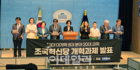[이데일리 김유성 기자]조국혁신당이 27일 새정부 출범을 염우에 둔 중장기 개혁 구상을 발표했다. ‘3대 대개혁, 8대 분야, 20대 과제’를 중심으로 한 이 구상은 검찰권 해체, 다당제 제도화, 사회권 헌법 명시, 기재부 개편, 조세정의 실현, 개헌과 AI·기후경제 대전환 등을 골자로 두고 있다.