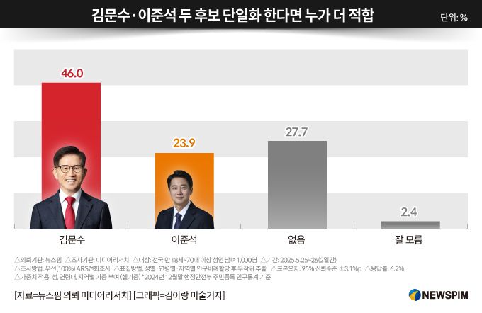 종합뉴스통신사 뉴스핌이 여론조사회사 미디어리서치에 의뢰해 지난 25~26일 이틀 동안 전국 만 18세 이상 남녀 1000명을 대상으로 진행한 자동응답 시스템(ARS) 조사에서 '김 후보와 이 후보가 단일화를 한다면 누가 더 적합한가'라는 질문에 응답자들은 김문수 46.0%, 이준석 23.9%, 없음 27.7%, 잘 모름 2.4%로 나타났다. 두 후보의 격차는 22.1%p다.