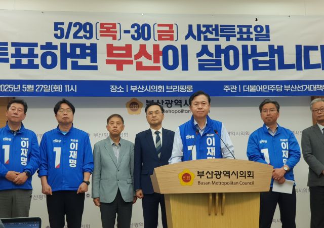 제26대 대통령 선거 사전투표를 이틀 앞두고 더불어민주당 부산시당 선거대책위원회가 27일 오전 부산시의회 브리핑룸에서 긴급 기자회견을 열고 “민생과 민주주의 회복을 위해 반드시 투표에 참여해달라”며 시민들에게 적극 동참을 호소했다.