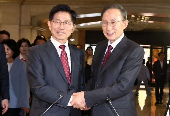김문수 국민의힘 대선후보와 이명박 전 대통령이 27일 서울 여의도 켄싱턴 호텔에서 만나 인사를 하고 있다. <ⓒ투자가를 위한 경제콘텐츠 플랫폼, 아시아경제(www.asiae.co.kr) 무단전재 배포금지>이 기사의 카테고리는 언론사의 분류를 따릅니다.0공유하기