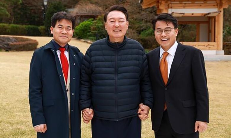 한국사 강사 전한길(왼쪽)씨가 지난달 10일 자신이 운영하는 사이트 '전한길 뉴스'에 올린 윤석열 전 대통령·윤상현 국민의힘 의원과 함께 찍은 사진. 전날 서울 한남동 대통령 관저에서 촬영됐다. 전한길 뉴스 캡처 |