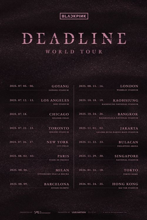 이로써 블랙핑크는 총 16개 도시, 31회차에 걸쳐 전 세계 팬들과 함께 호흡하게 됐다. 앞서 이들은 오는 7월 5일과 6일 고양을 시작으로 로스앤젤레스, 시카고, 토론토, 뉴욕, 파리, 밀라노, 바르셀로나, 런던, 도쿄로 향하는 일정을 발표한 바 있다.