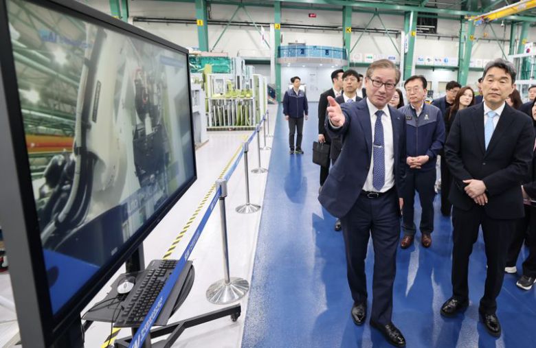 이주호 대통령 권한대행 부총리 겸 교육부 장관(앞줄 오른쪽)이 27일 경남 사천 한국항공우주산업(KAI)에서 강구영 KAI 사장(앞줄 왼쪽)의 설명을 듣고 있다. 교육부 제공 |