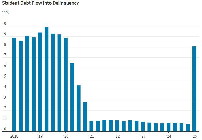 특히 도널드 트럼프 행정부가 이달 들어 수백만 명의 대출자들을 대상으로 추심하기 시작하면서 미국인들의 부담도 커졌다. 당국은 대출자 임금과 세금 환급금, 연방 지원금 등의 압류를 경고하고 나섰다. 이러한 추심 절차는 팬데믹 이전에도 같았지만, 당시 상황을 잊어버린 사람들에게는 충격일 것이라고 WSJ는 짚었다.