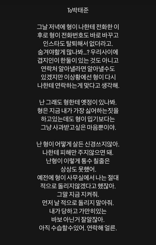 먼저 강혁민은 “그날 저녁에 형이 나한테 전화한 이후로 형이 전화번호도 바로 바꾸고 인스타도 탈퇴해서 없더라고. 숨겨야 할 게 많나봐..? 우리 사이에 겹지인이 한둘이 있는 것도 아니고 연락처 알아낼라면 알아낼 수도 있겠지만 이 상황에선 형이 다시 나한테 연락하는 게 맞다고 생각해”라고 글을 시작하며 박태준에게 메시지를 전했다.