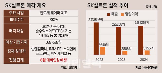 매각 대상은 SK가 직접 보유한 지분(51%)과 총수익스와프(TRS) 계약을 통해 사실상 소유 중인 지분 19.6% 등 총 70.6%다. 최태원 SK그룹 회장이 개인 자격으로 보유 중인 나머지 지분(29.4%)는 이번 매각 대상에서 제외됐다. 지난해 연결 기준 매출 2조1268억원, 영업이익 3155억원을 기록했으며 국내 반도체 실리콘 웨이퍼 시장 1위, 글로벌 기준으론 5위 기업이다.