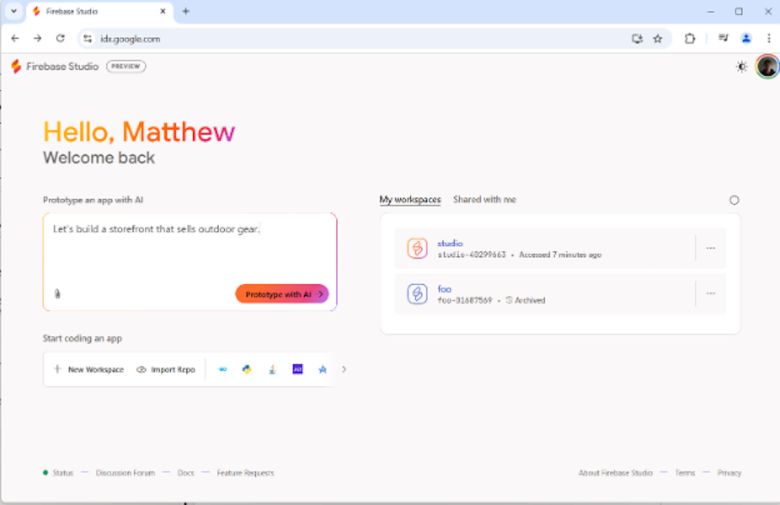 웹용 마이크로소프트 VS 코드의 레이아웃과 비슷하다. 다만 그 경우에는 IDE를 VM에 연결하는 반면 파이어베이스 스튜디오에는 관리되는 내부 환경이 있다.