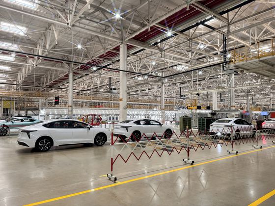 지난해 5월 중국 장시성 난창의 장링 신에너지차 생산라인에서 완성된 차량들이 최종 테스트를 기다리고 있다. 신경진 기자