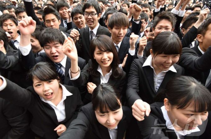 일본 도쿄에서 열린 취업 관련 행사에 대학생들이 구호를 외치고 있다. /AFPBBNews=뉴스1