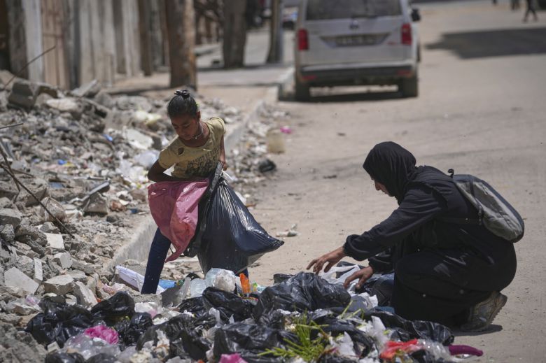 27일 가자지구의 한 거리에서 모녀가 쓰레기 더미를 뒤져 먹을 것을 찾고 있다. AP연합뉴스