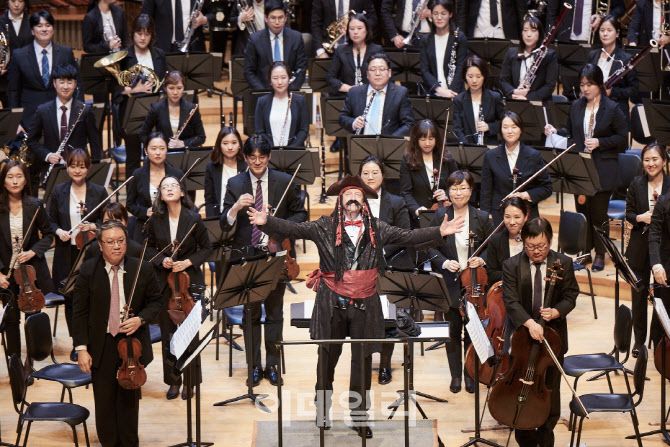 2018년 롯데콘서트홀 ‘한스 짐머 VS 존 윌리엄스’ 국내 초연에서 영화 ‘캐리비안의 해적’ 주인공 잭 스패로우로 분한 지휘자 앤서니 잉글리스. (사진=롯데문화재단) |