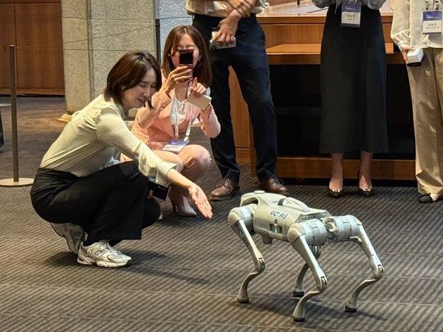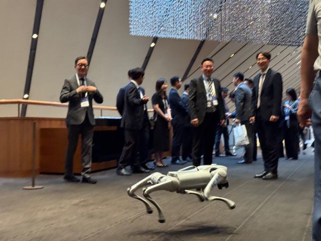 대형견 사이즈의 사족보행 로봇이 27일 오후 서울 한복판에 있는 호텔 로비를 활보하는 모습에 관중들 사이에서는 '이질적이다', '귀엽다'는 상반된 반응이 나왔다. 서울 중구 신라호텔에서 열린 '서울포럼 2025'에 등장한 유니트리 GO2 로봇이다. 서울경제신문이 ‘이미 시작된 미래, 모든 것은 AI로 통한다’로 주최한 포럼에는 로봇과 AI를 접목한 다양한 볼거리가 마련됐다.