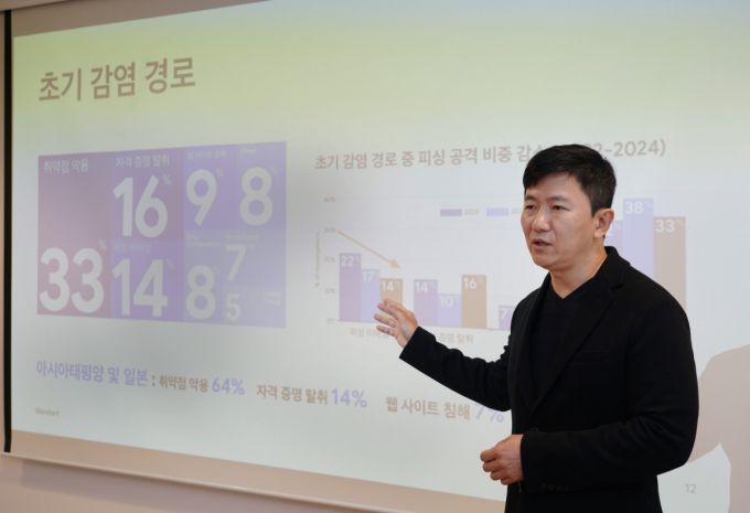 심영섭 구글 클라우드 맨디언트 컨설팅 한국·일본 총괄이 27일 서울 중구 서울스퀘어에서 열린 미디어 브리핑에서 연례 조사보고서 'M-트렌드 2025' 주요내용을 발표하고 있다./사진제공=구글 클라우드