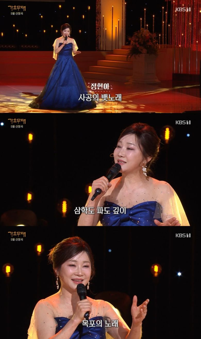 정현아는 지난 26일 방송된 KBS 1TV '가요무대'에서 1935년 발표된 이난영의 '목포의 눈물'을 열창했다.