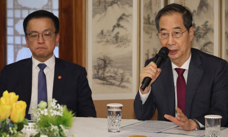 Then-Prime Minister and acting President Han Duck-soo attends a meeting of the Economic Security Strategy Task Force at the Seoul official residence on April 14, 2025. At left is then-Deputy Prime Minister and Finance Minister Choi Sang-mok./Yonhap |