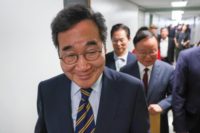 이낙연(맨 왼쪽) 새미래민주당 상임고문이 27일 서울 여의도 당사에서 김문수 국민의힘 대선 후보와의 개헌·공동정부 연대와 김 후보 지지를 선언하는 기자회견을 마친 뒤 이동하고 있다. 왼쪽 세 번째는 김 후보 캠프에서 비서실장을 맡고 있는 김재원 전 국민의힘 의원. 뉴스1 |